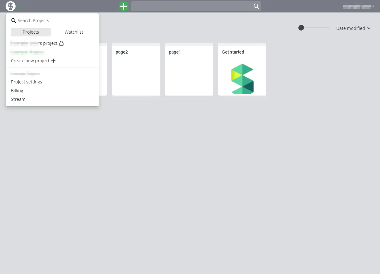 - Press the “S” button at the top left of the screen, and then select “Create new project”. The “Create new project” button may appear on the screen immediately after you create an account.