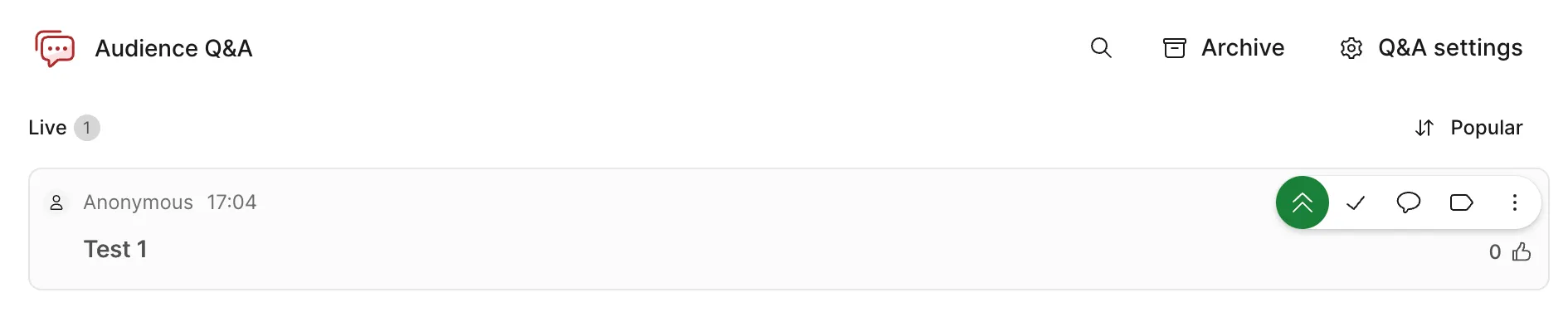 If you click Archive at the top right of the screen, a list of archived questions/comments will be displayed. Hovering the cursor over each question/comment reveals the following button (in addition to those already mentioned), allowing you to perform actions on it.