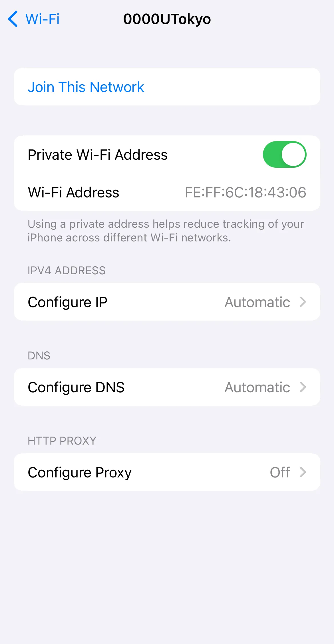 Tap the SSID found in Step 2, select “Forget this Network”. When the screen saying “Forget Wi-Fi network “0000UTokyo”?” comes up, select “Forget”.